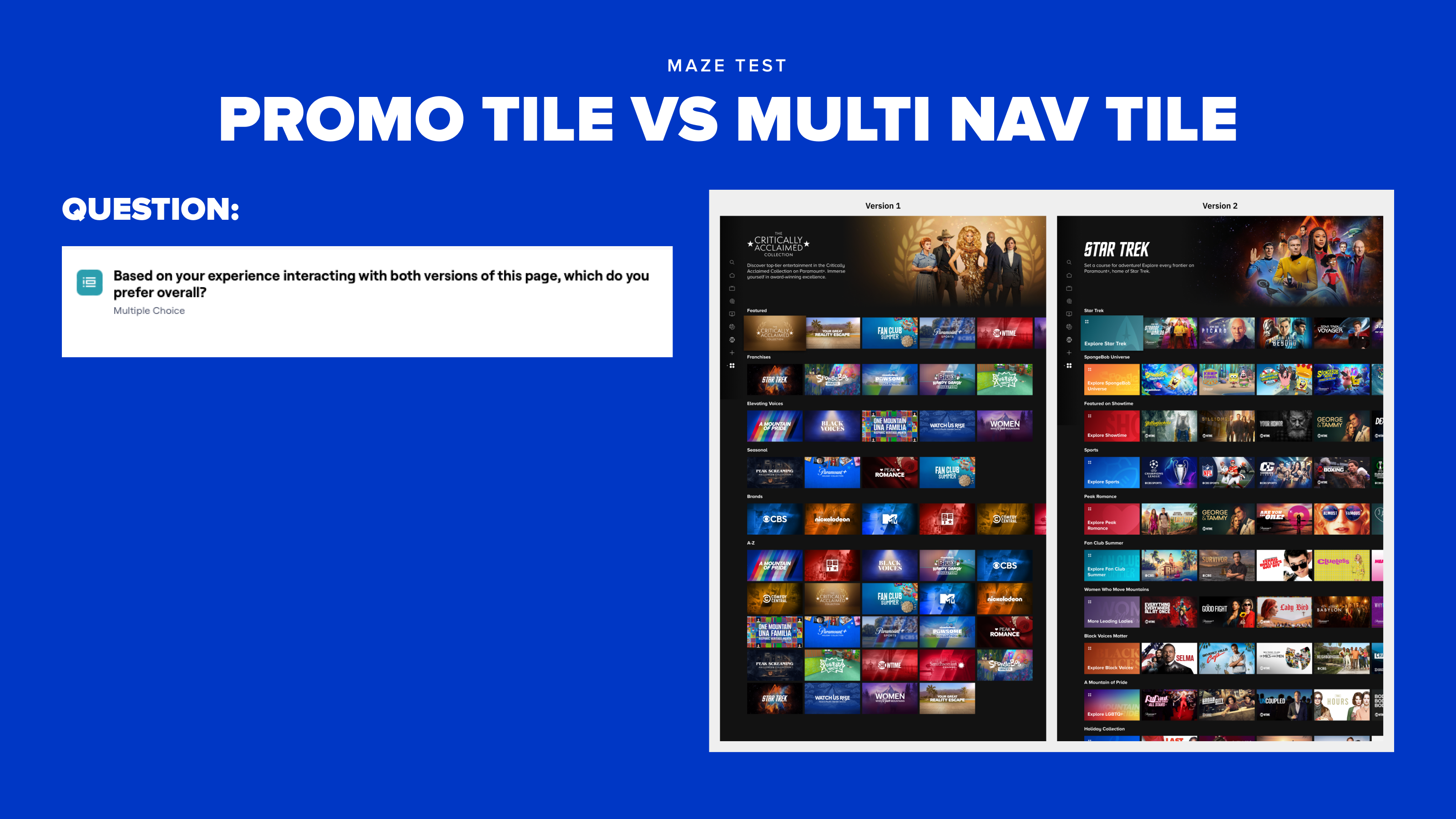 Today, our browse pages are where users can look through the entire Paramount+ content library, and apply filters to find titles that fits their interests. The filters today manifest as genres that allow the user to filter down a grid of content. While this is helpful for finding content of interest, it still isn't enough to help the user make a decision on what to watch as indicated by the high bounce rates.