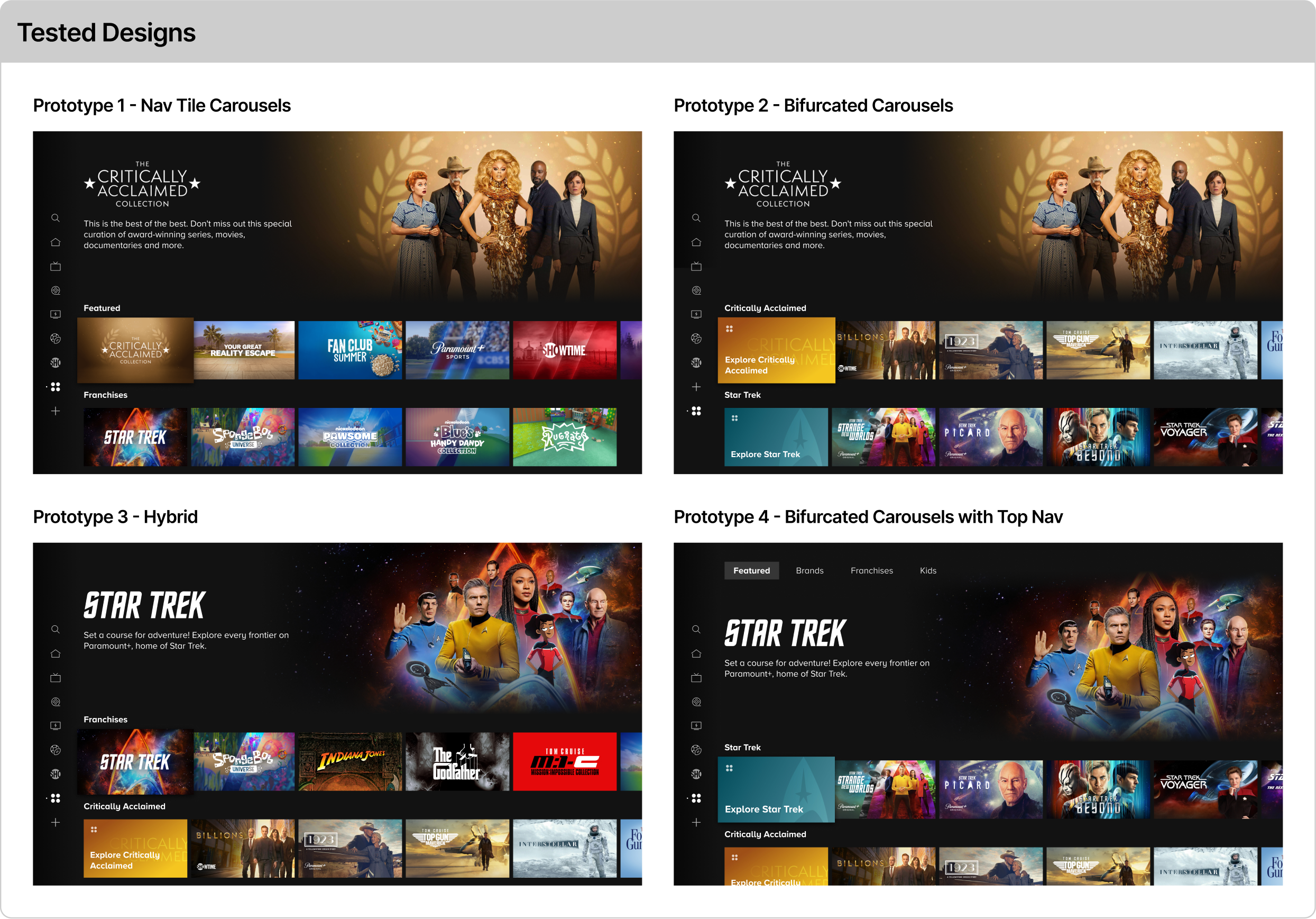 Design a scalable page structure flexible enough to provide users with the controls and context they’ll need to sufficiently guide them in their decision-making process when browsing for content in existing and future use cases. Applications for this page include, but are not limited to, browsing for shows, browsing for movies, and browsing for collections.
